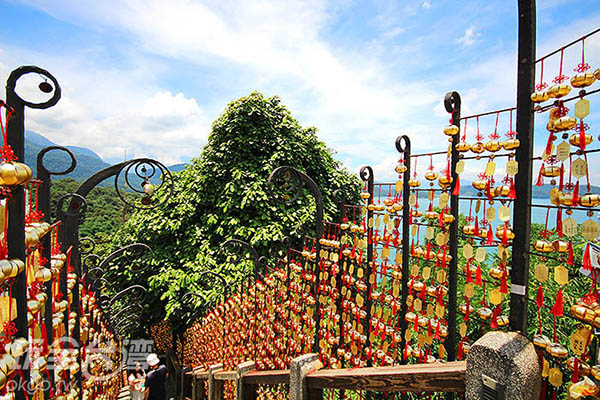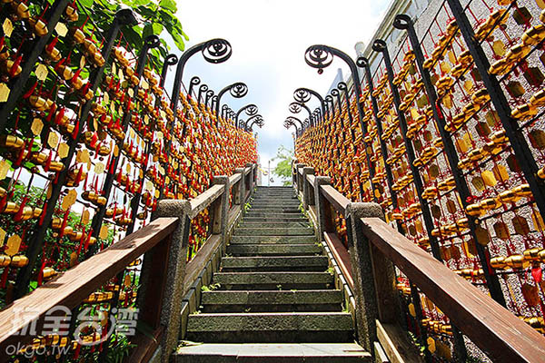 步道兩側鐵杆上掛滿了祈福的風鈴,每一個風鈴都寫上了民眾的祈願內容,紅色的中國結加上金黃色彩、燈籠形狀的風鈴,充滿喜氣洋洋的節慶氣息。