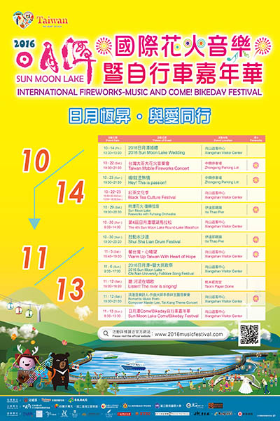 活動最後一天為11月13日的自行車嘉年華,內容包含了兒童滑步車趣味競賽、單車逍遙遊、環潭挑戰遊以及松柏嶺自行車挑戰,喜愛單車活動的旅客不妨與家人相約來場健康的自行車約會吧!